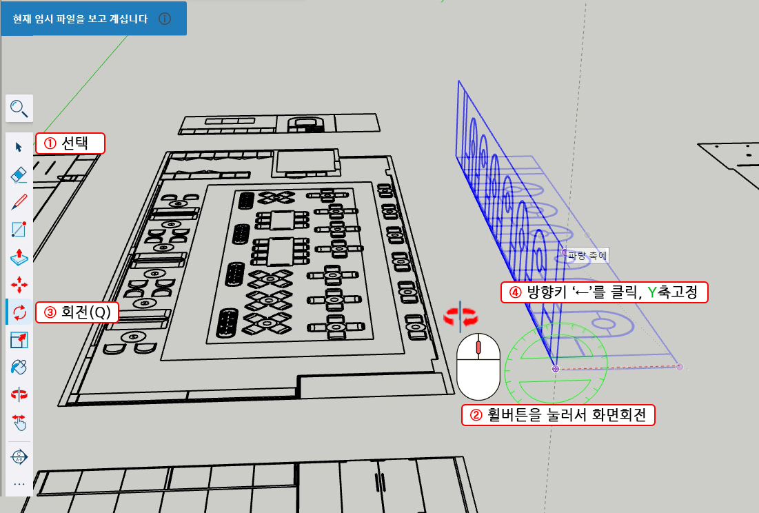 단, 출입구입면, 카운터입면은 회전축을 X축(단축키 방향키 → )기준으로 회전한다.