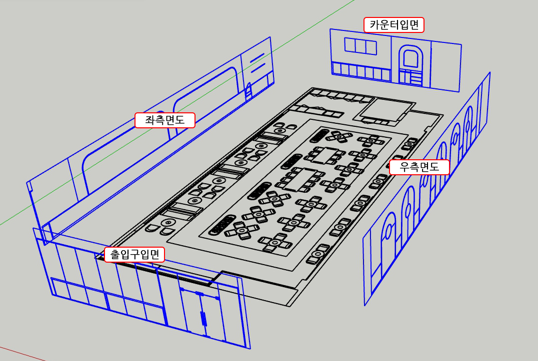 나머지 입면도들(좌측면도, 출입구입면, 카운터입면)을 1~7번 과정을 참고로 90도로 세워보자.