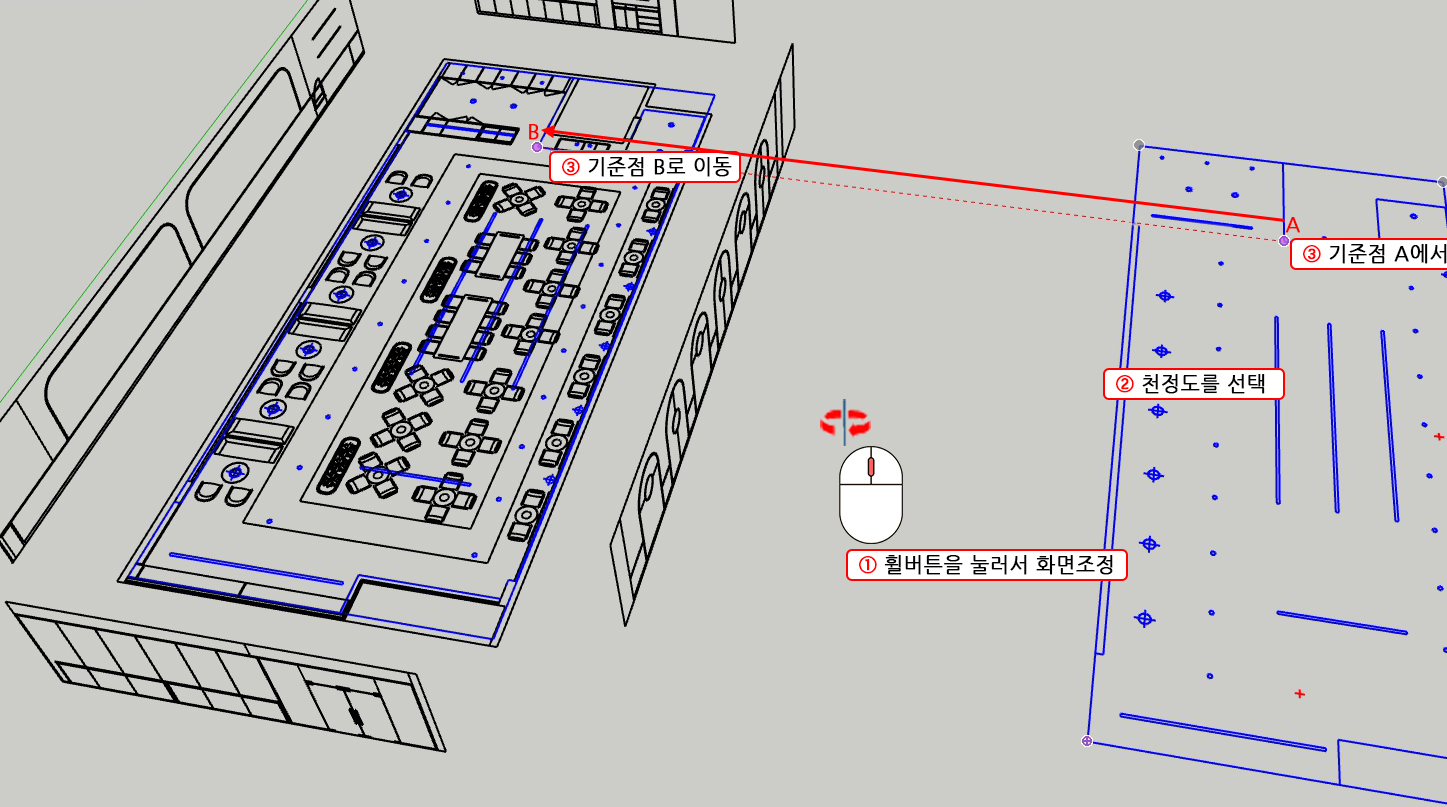 이제 천정도를 평면도에 맞게 위치를 맞추고 높이를 천정높이에 맞게 이동하여 줄것이다.