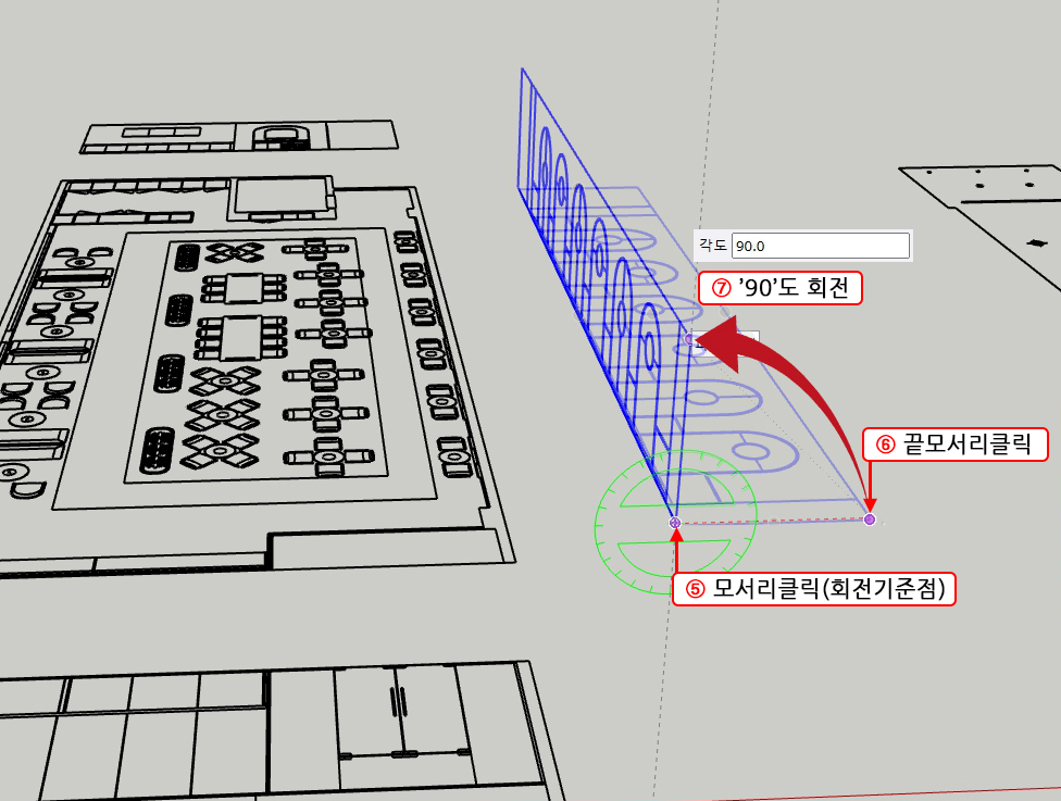 7. 90도가 될 때까지 왼쪽에서 오른쪽으로 회전시켜준다. 스냅이 걸려있어서 90도로 맞추기가 쉬울 것이다. (이때 그냥 숫자 키보드에서 '90'를 입력하면 자동으로 90도가 될 것이다. 많이들 사용하는 방법이다.)
