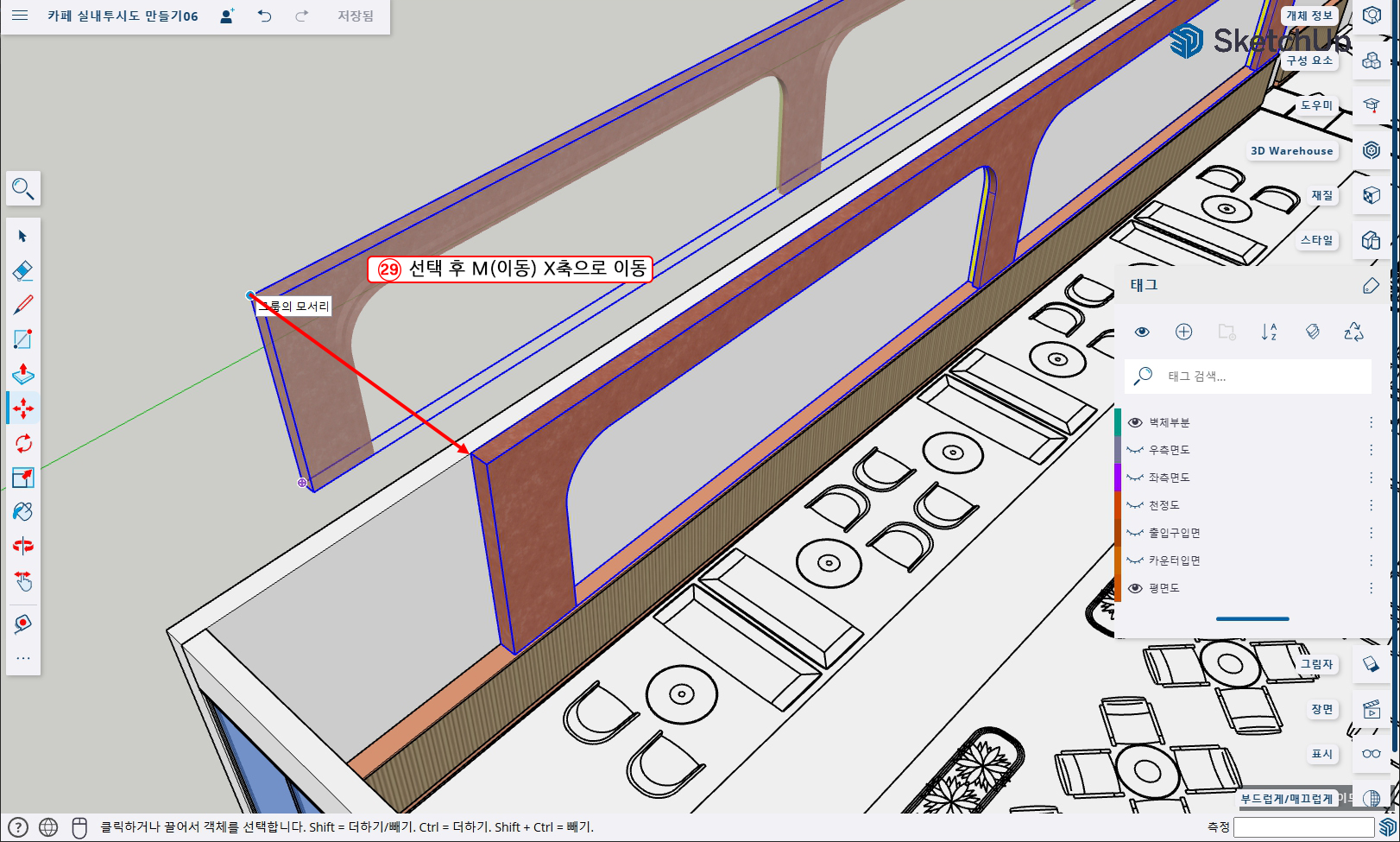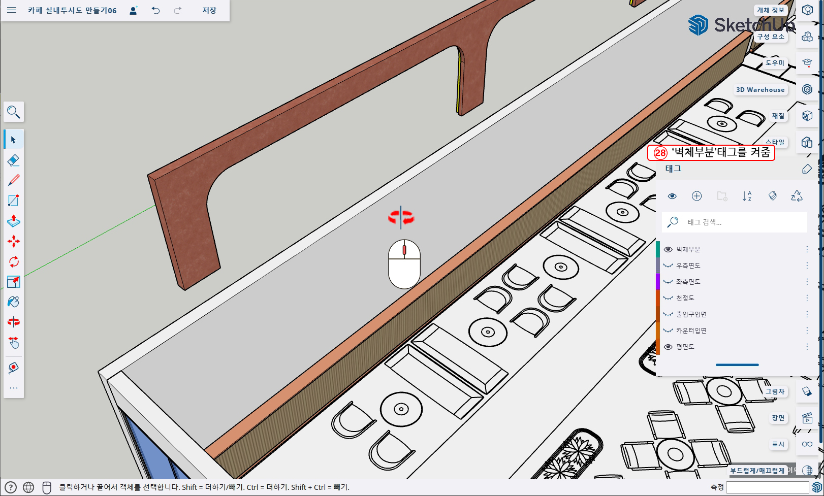 28. 태그를 열어 '벽체 부분'태그를 켜준다음 화면을 이동하기 편하게 조정해 준다.