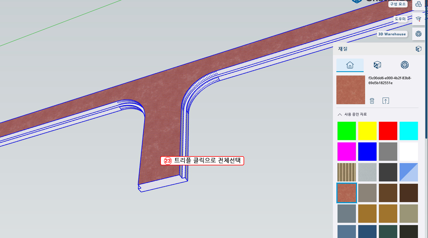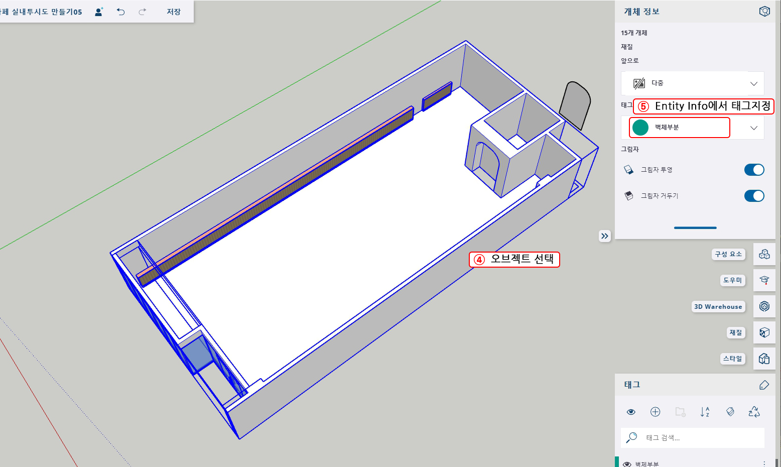 5. 우클릭 후 Entity Info를 선택하거나 우측트레이 최상단에 Entity Info(개체 정보) 태그를 선택한 후 태그를 '벽체 부분'태그로 지정해 준다.