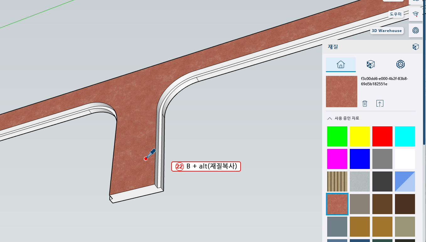 22. B + alt (재질복사)하여 핑크색 벽 재질을 복사한다.