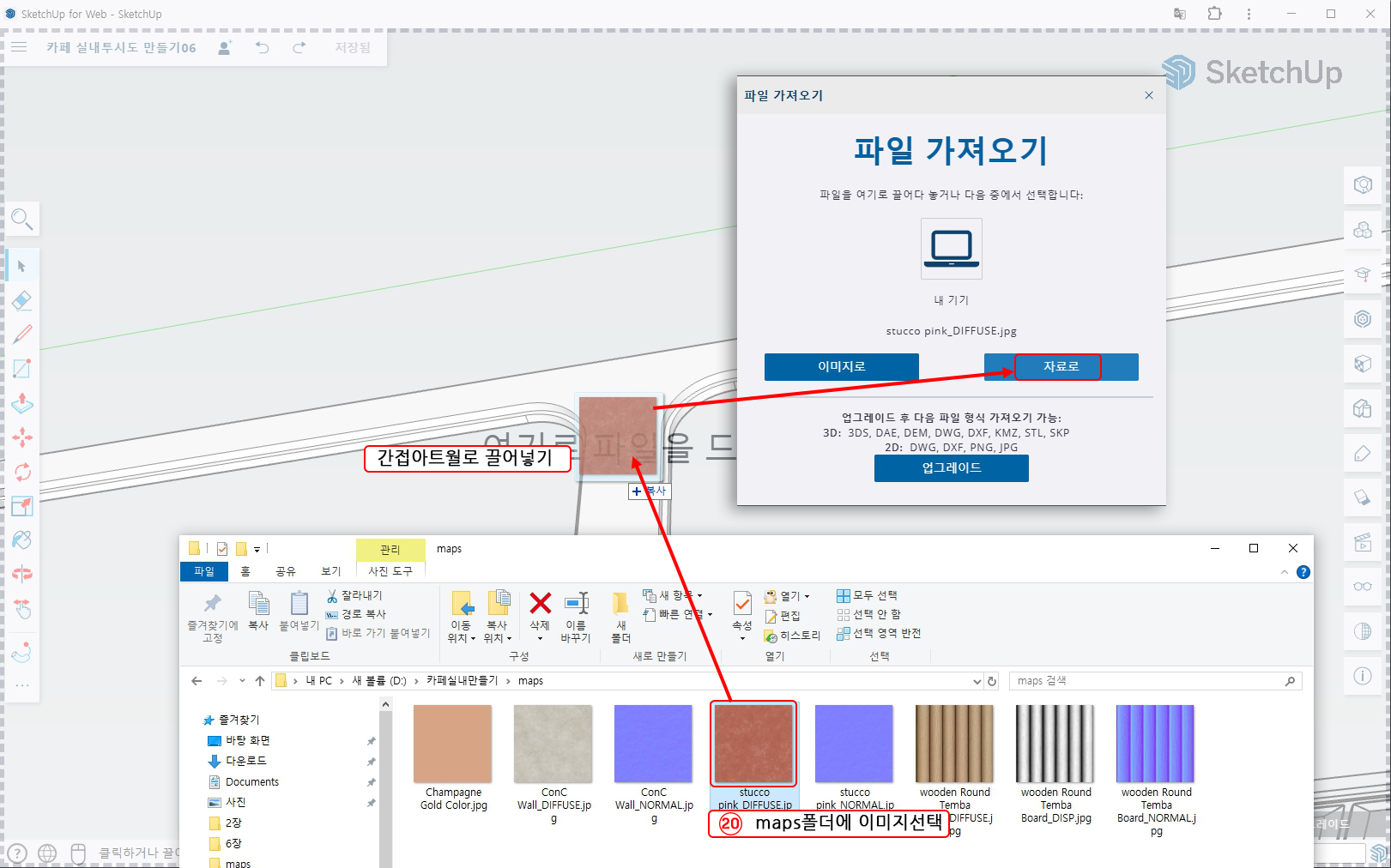 20. maps폴더를 열어 stucco pink_DIFFUSE.jpg파일을 끌어당겨서 오브젝트에 적용하면 파일 가져오기 메시지가 뜨면 자료로를 눌러준다.