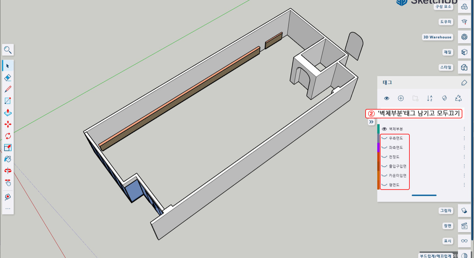 2. '벽체 부분'태그만 남기고 전부 꺼준다.