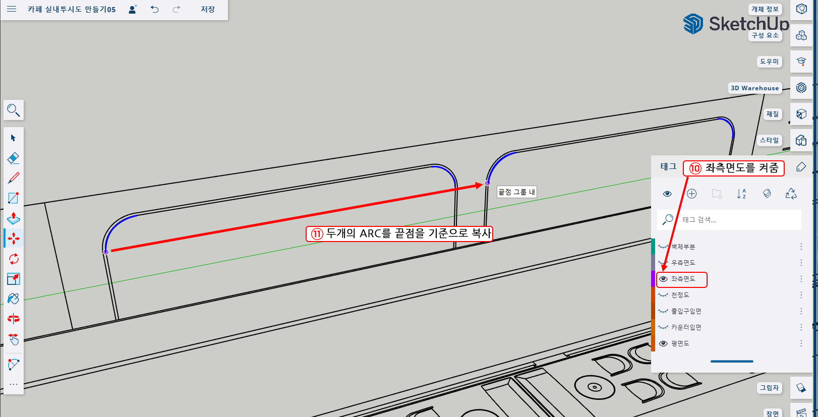 10. 태그에서 ' '좌측면도' 태그를 다시 켜준다. (다음 복사할 위치를 볼 수 있어야 하기 때문에)