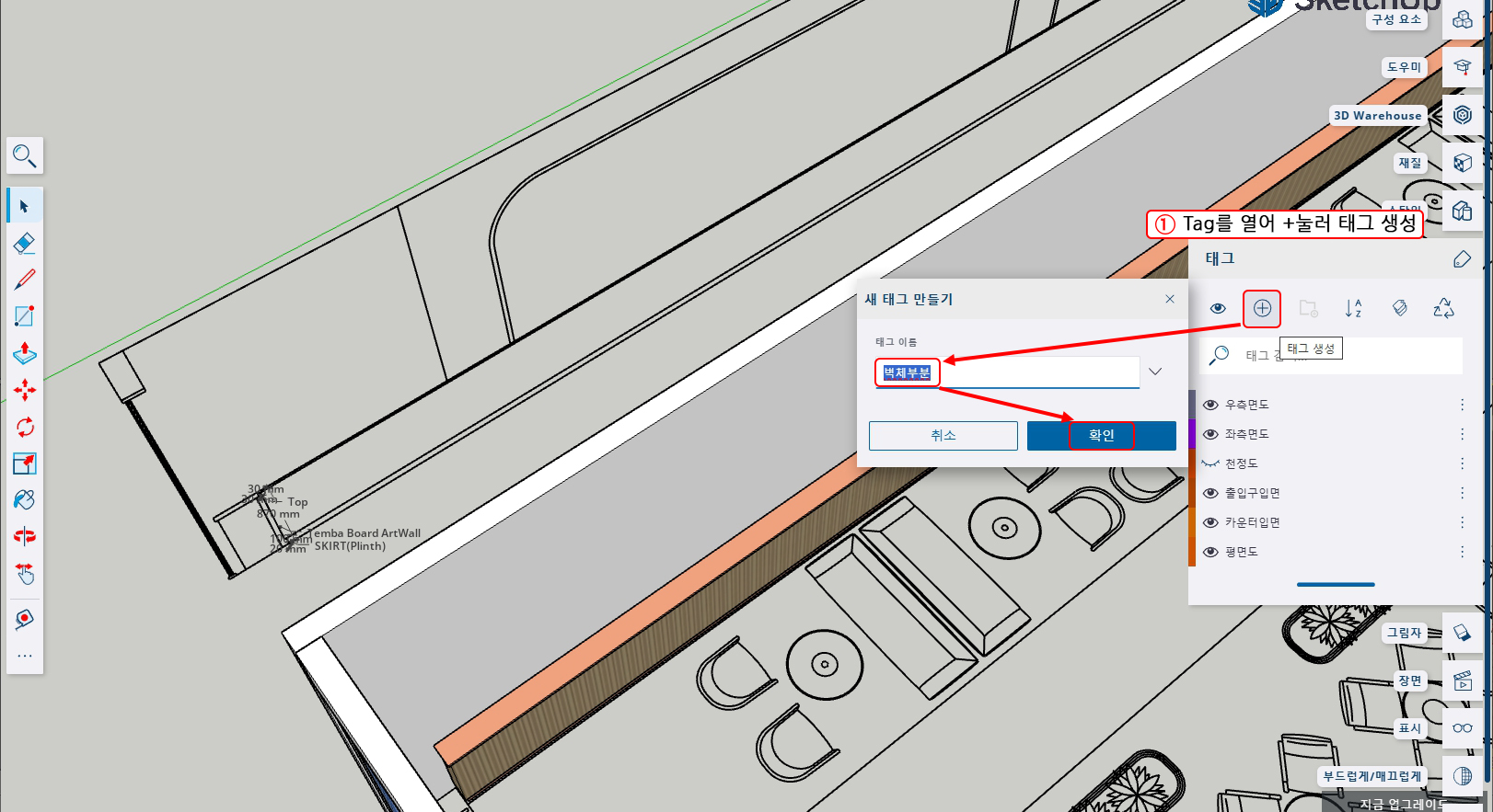 1. 우측에 태그 트레이를 열어서 +를 눌러 태그 생성을 하고 태그이름을 '벽체 부분'이라고 한다.