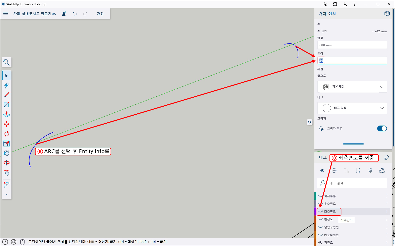 9. 아크 두 개를 각각 선택하여 Entity Info에서 Segment(조각) 값을 '36'로 고쳐준다. (부드러운 아크를 그리기 위해서)